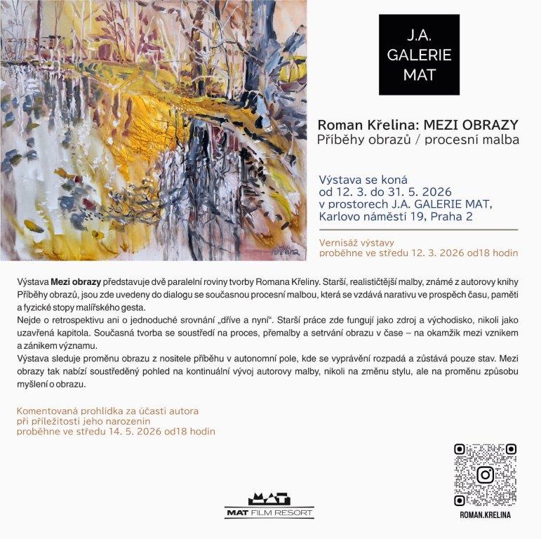 Výstava Mezi obrazy představuje dvě paralelní roviny tvorby Romana Křeliny. Starší, realističtější malby, známé z autorovy knihy Příběhy obrazů, jsou zde uvedeny do dialogu se současnou procesní malbou, která se vzdává narativu ve prospěch času, paměti a fyzické stopy malířského gesta.